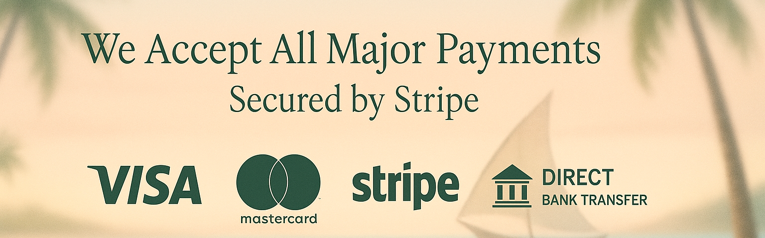 We accept all major cards and secure transfers to make your experience seamless and safe